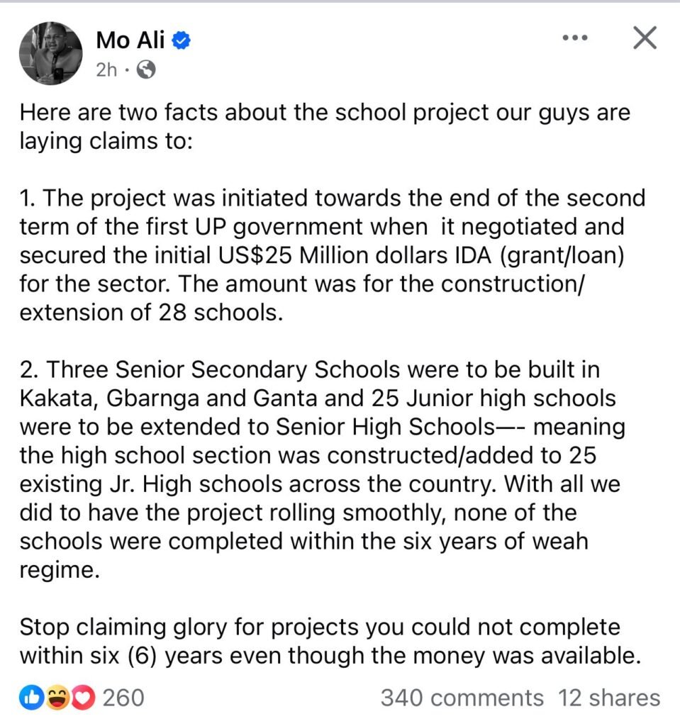 The Gbarnga Model School was initiated under George Weah, designed under Ansu Sonii, and funded by the World Bank long before Boakai took office. Anything else is political dishonesty and the Unity Party must be held to account.